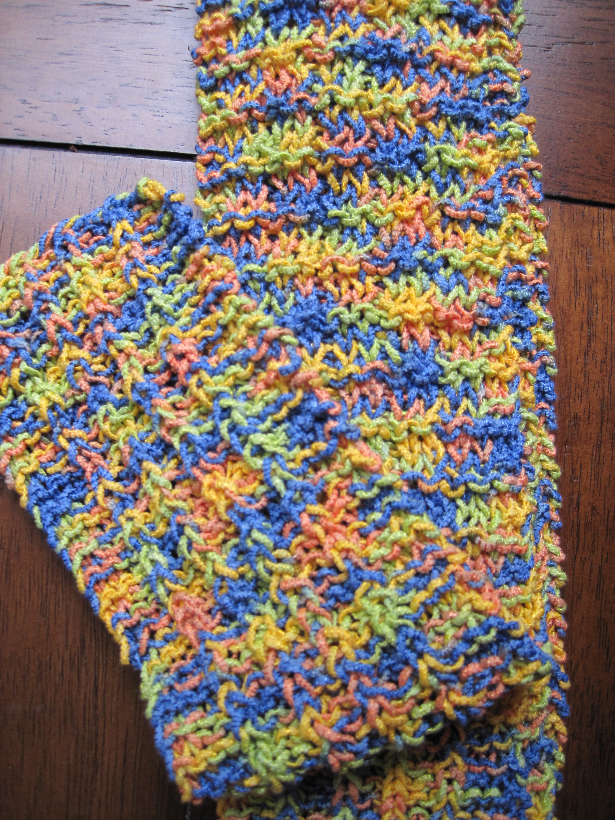 With highly-variegated yarns ((By “highly variegated” I mean yarns that have lots of different colors mixed together, not merely different tones of one color.)) I have found that scarves are a good option. I have made four scarves, using four different highly-variegated yarns, and they all were lovely. The first such scarf I finished was one made for my mom. She approved the yarn ((It was in my stash–I told you I bought variegated yarn!)) and I chose a basketweave pattern ((My Basketweave Summery Scarf pattern is available for download under the “Patterns” page tab.)) because I like to use reversible patterns for scarves since both sides are often visible. I was very pleased with the end result, as was my mom, and it encouraged me to keep trying variegated yarn.