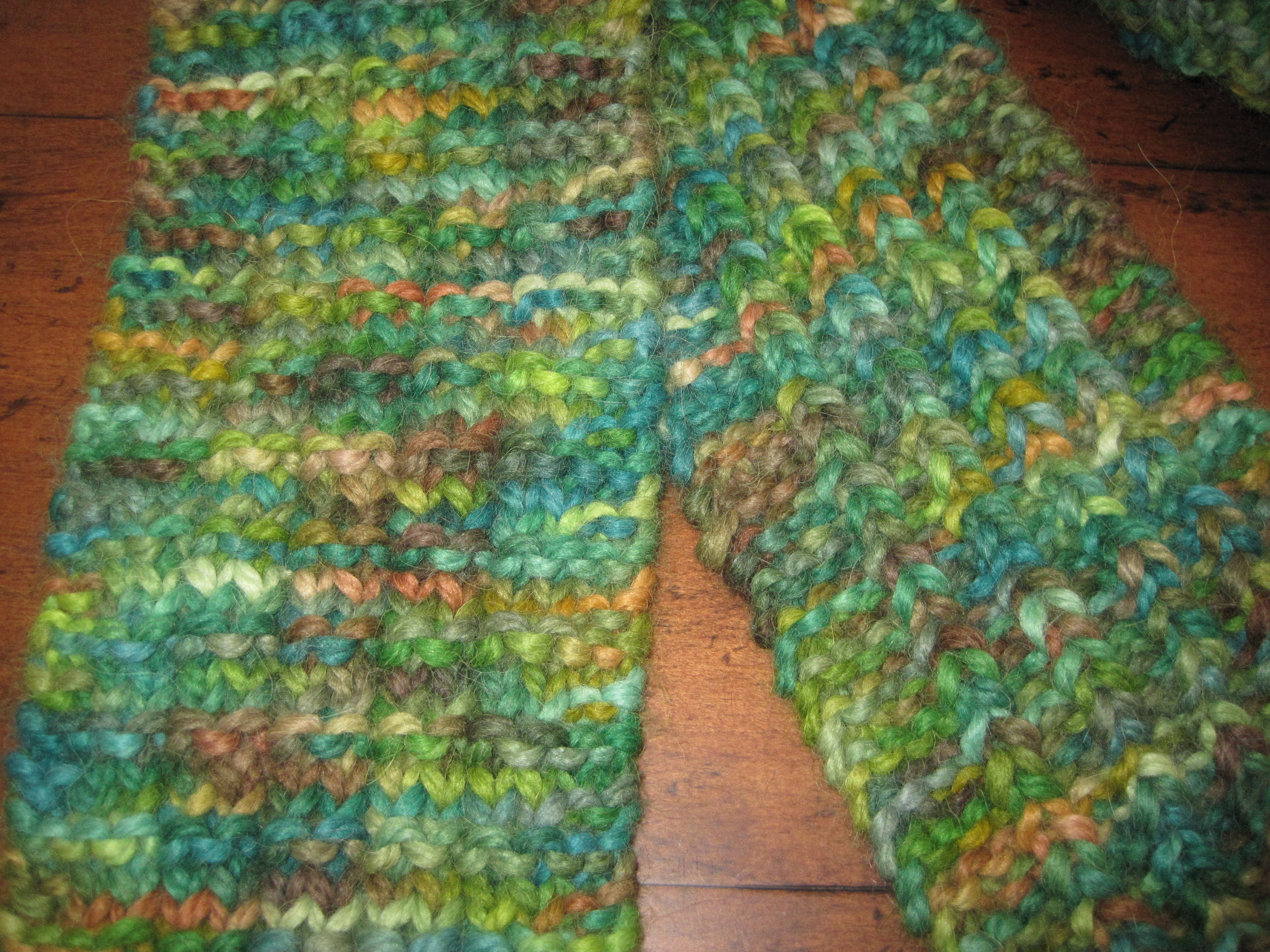 I just started knitting a scarf for my daughter using variegated yarn, and as I was winding up the hank I thought back to when I first began knitting and how I shied away from using variegated yarn because I could never envision what a ball or hank of multi-colored yarn would look like when knitted up. ((Now that’s not to say that I didn’t buy variegated yarn–I love color, and there are so many beautiful color combinations out there in the yarn world–but it did take me a long time to find a potential project and to be brave enough to try using it.)) I still have trouble seeing in my head what the end result will be just by looking at the variegated hank, but over the last couple of years I have gained a general understanding of variegated yarn, and I am now a braver knitter, and willing to experiment.
