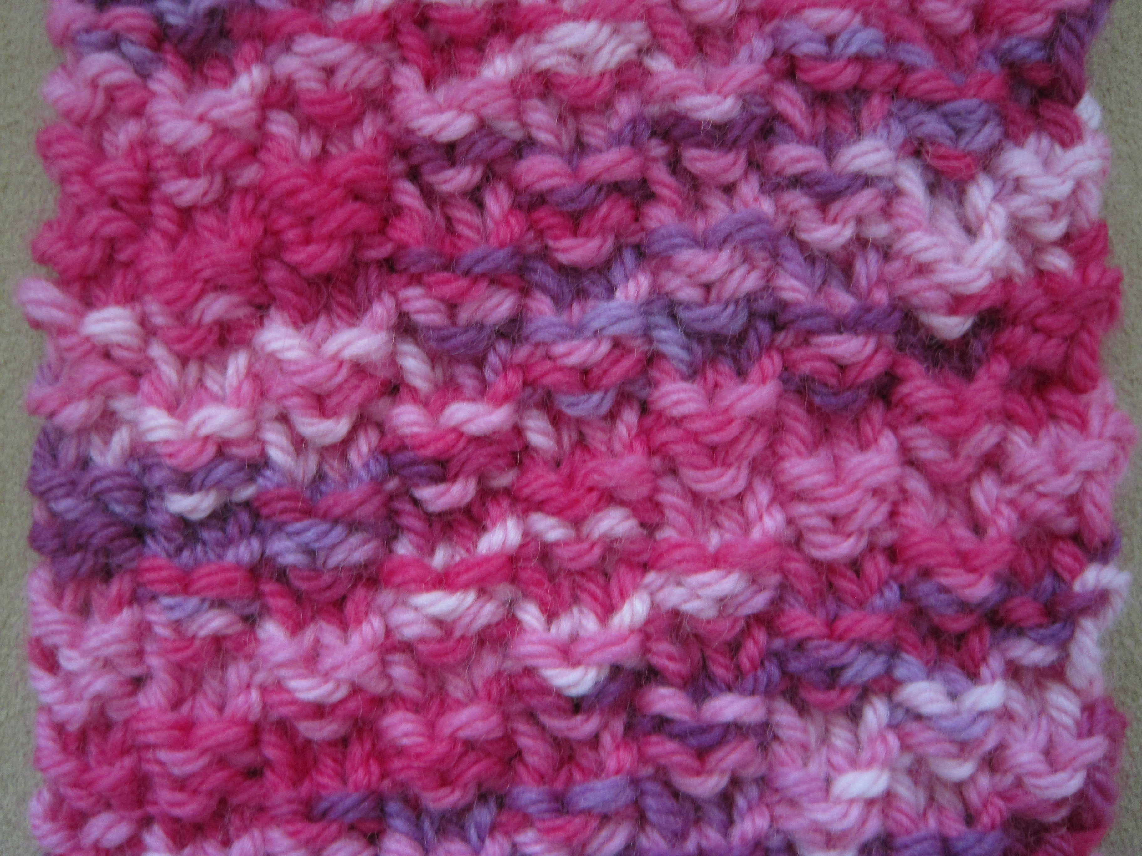 My daughter got a new dark purple winter jacket and I thought–aha!–I can use that pink and purple variegated yarn in my stash to make her a scarf and hat (and maybe even mittens if I get really industrious). Since the yarn has so much color, I wanted a simple pattern, and since it’s a scarf, I wanted something reversible and that would lay flat.