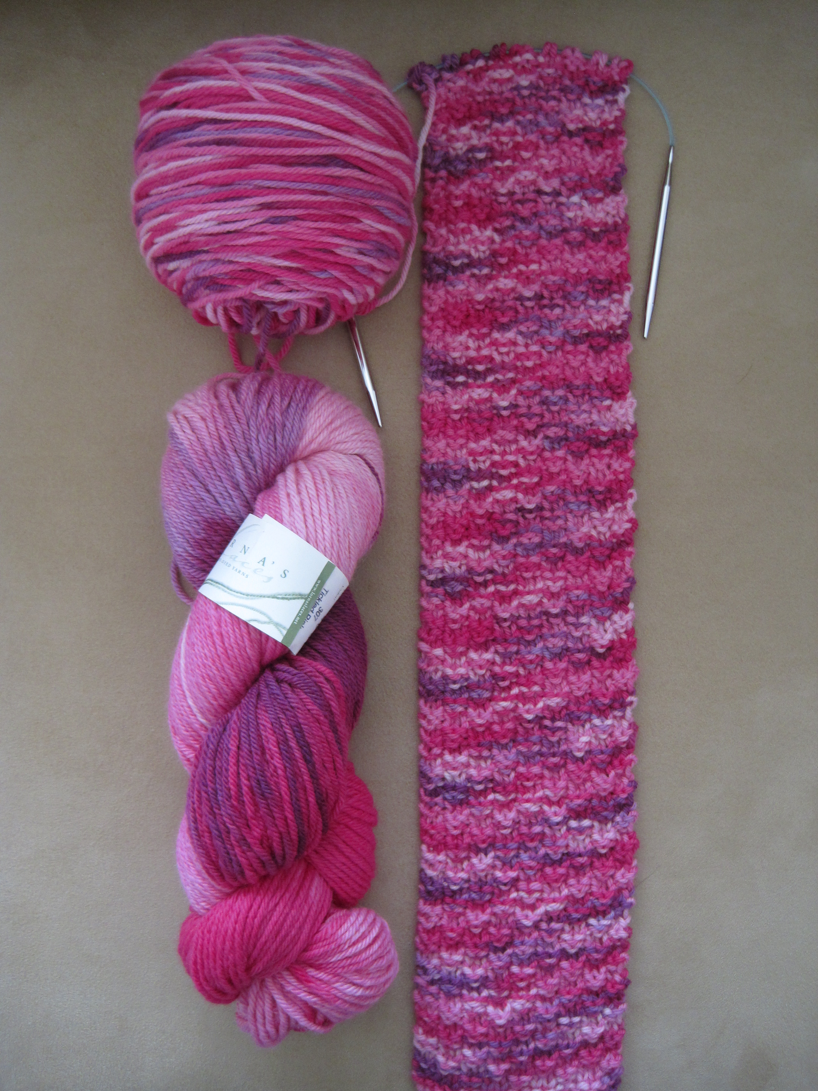 - My daughter’s scarf in progress. Here you can see what the variegated yarn looks like when it’s in a hank, wound into a ball, and knitted up.